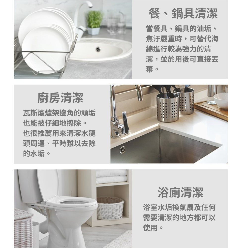◆不使用研磨劑,使用粗硬的紋理去除頑強汙垢。可用於瓦斯爐焦汙、水槽或浴室的水垢。